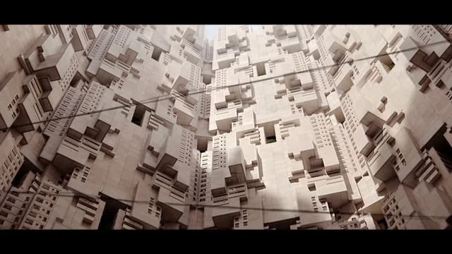 We created a base algorithmic structure that served as a blueprint for each form and movement in the film. The CGI architectural structures were covered in high‑resolution photographic textures and embellished using a custom‑designed system that controls the foliage, architectural details, and other nuances. The result is a monolithic structure of massive scale and incredible detail.